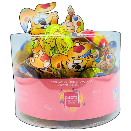 Storz Kleckshase aus feiner Vollmilchschokolade – 35 massive Schokoladenfiguren auf farbenfroher Kartonbasis mit Paashaasmotiv. Der freche Hase überzeugt nicht nur optisch, sondern auch mit zartschmelzender, vollmundiger...