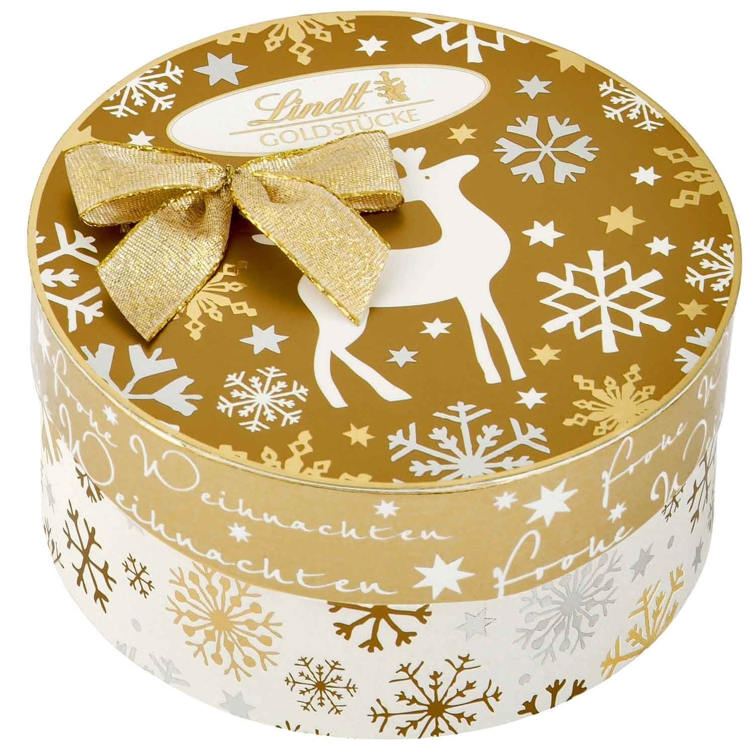 Runde Geschenk-Idee. Wenn zu Weihnachten Gold und Weiß zusammentreffen, entsteht ein Hauch von Luxus. Die Lindt Chocolatiers haben mit viel Liebe zum Detail hochwertige Geschenke kreiert und sorgen mit den "Goldstücken" für eine festliche Weihnachts-Stimmung. In der Rundschachtel verbergen sich Pralinés aus Alpenvollmilchschokolade mit folgenden unterschiedlichen Füllungen: Bratapfel-Vanille, Walnuss-Dessert und Zimt-Koriander. Und mit dem praktischen Geschenk-Kärtchen für Ihre persönliche Nachricht wird diese Präsent-Idee gekonnt abgerundet.