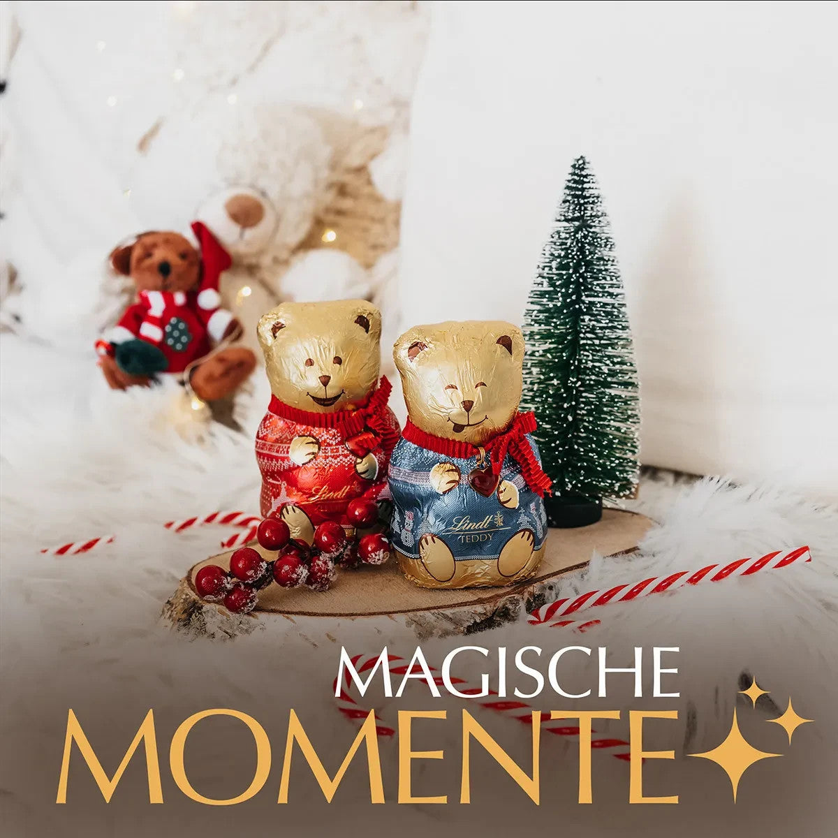 Zartschmelzende Vollmilch-Schokolade. Was wäre die Weihnachtszeit ohne den Lindt Teddy. Mit viel Liebe zum Detail haben die Lindt Maîtres Chocolatiers diesen besonderen Teddy aus feinster Vollmilch-Chocolade kreiert. Als Dekoration in der Weihnachtszeit oder auf dem bunten Weihnachtsteller darf er nicht fehlen. Vollmilch-Schokolade, Kakao: 30% mindestens Bitte beachten Sie, dass die Farbe (blau/grün) variiert und nicht wählbar ist.
